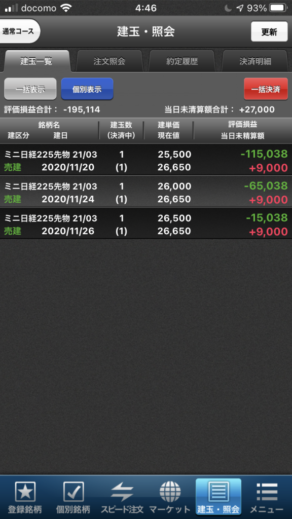 昨日26200円を付けて、26500円のポジションが利益で整理されました。